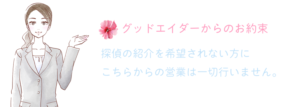 グッドエイダーはプロの現役探偵が離婚相談を行っています。ですが、ご相談される方の中には調査が必要ない方もいらっしゃると思います。そのため、こちらから探偵事務所の利用を促す営業等は一切行いません。実際に「探偵に調査を依頼したい」とご相談された時だけ、お悩みに合わせたおすすめの探偵事務所をピックアップしたり、探偵探しのサポートをさせていただきます。
